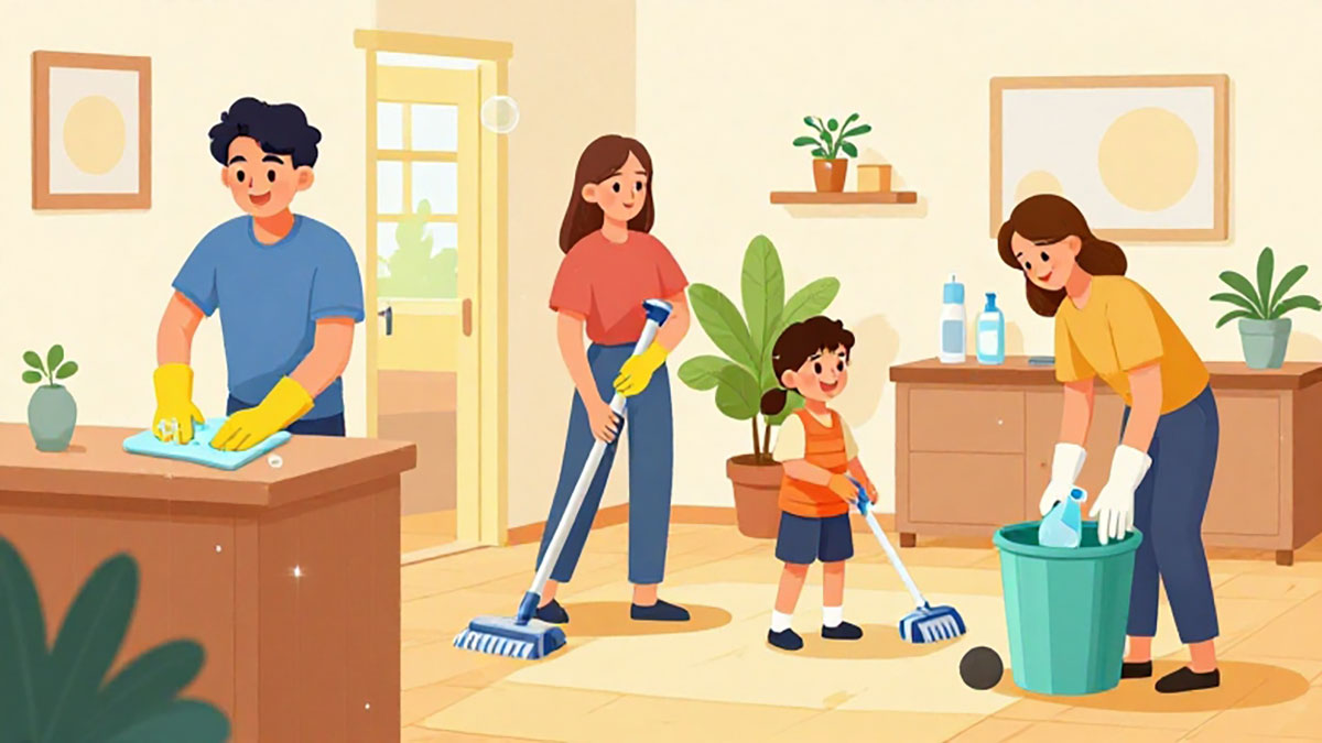 Menjaga kebersihan rumah sebaiknya tidak menjadi tanggung jawab satu orang saja. Seluruh anggota keluarga perlu dilibatkan agar kebiasaan hidup bersih dapat terbentuk sejak dini. Anak-anak bisa diajarkan untuk merapikan mainan setelah digunakan, membuang sampah pada tempatnya, serta membantu pekerjaan rumah ringan. Dengan kerja sama seluruh anggota keluarga, menjaga kebersihan rumah akan terasa lebih ringan dan menyenangkan. Selain itu, kebiasaan hidup bersih juga akan menjadi nilai positif yang terbawa hingga dewasa.